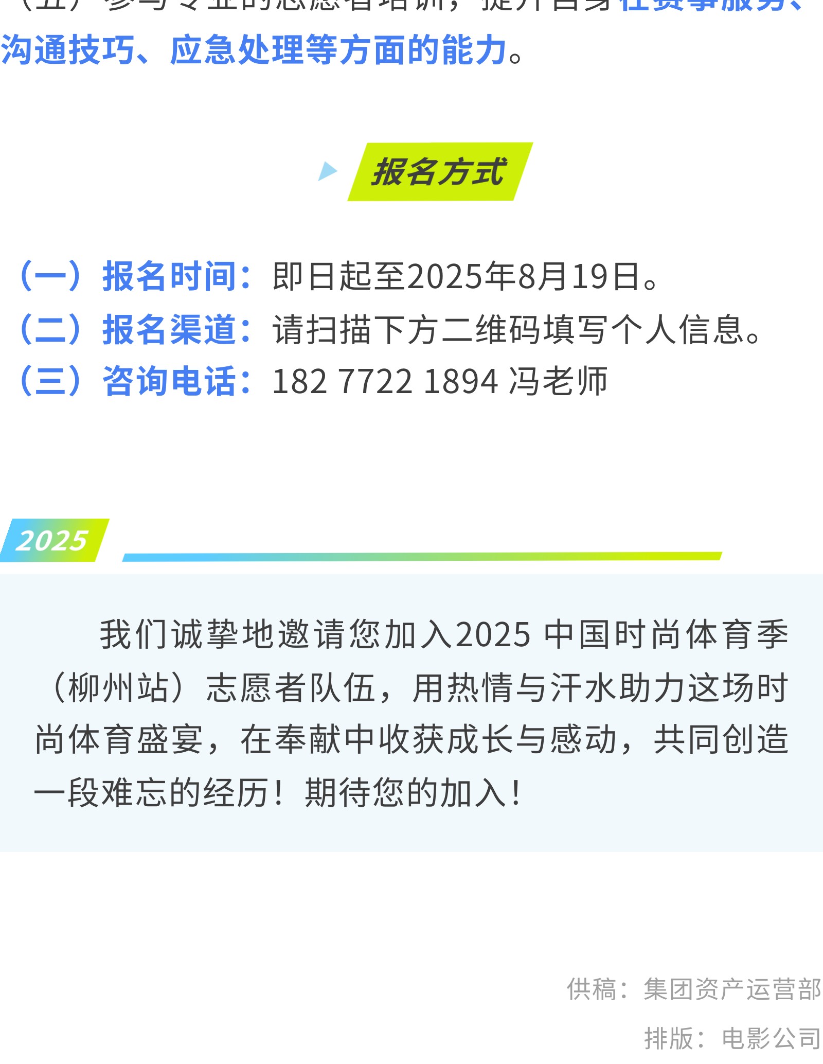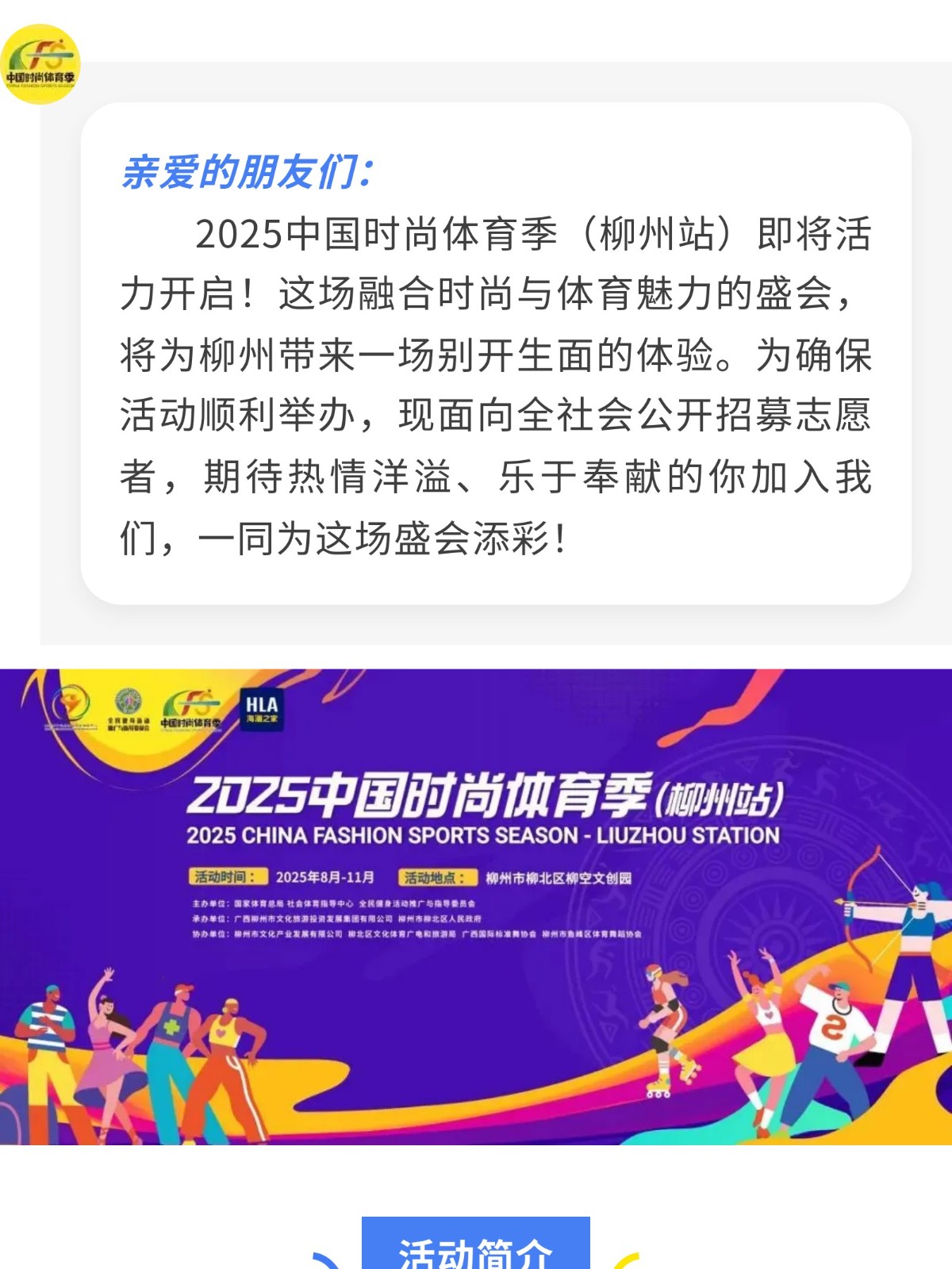 加入我們!2025 中國(guó)時(shí)尚體育季(柳州站) 志愿者招募中! 發(fā)布時(shí)間:2025年08月15日 10時(shí)來(lái)源:本站原創(chuàng)瀏覽:76 人次