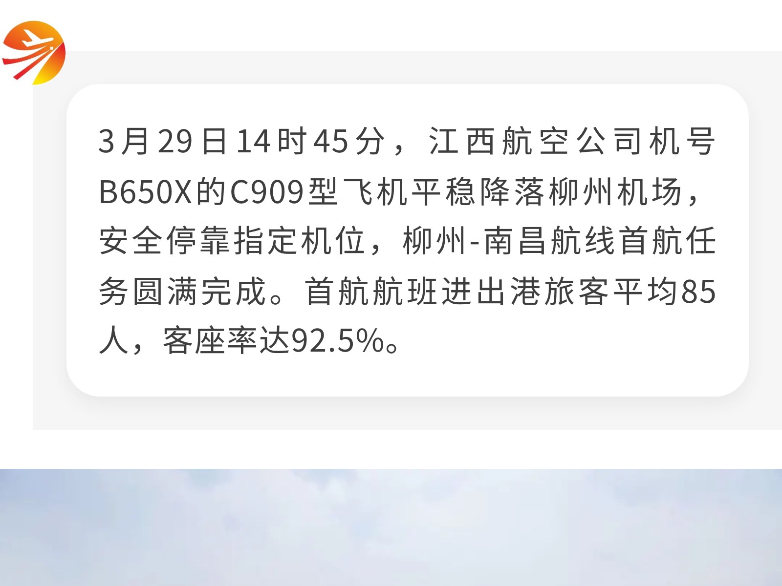 2026年夏秋航季南昌-柳州首航成功 發(fā)布時(shí)間:2026年04月01日 18時(shí)來(lái)源:本站原創(chuàng)瀏覽:4 人次