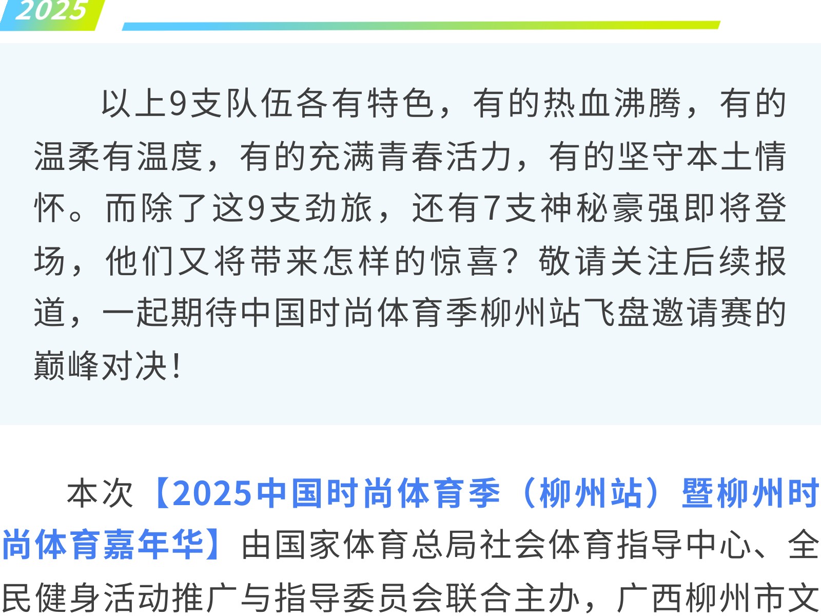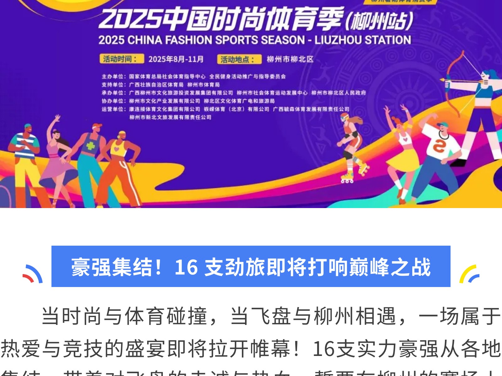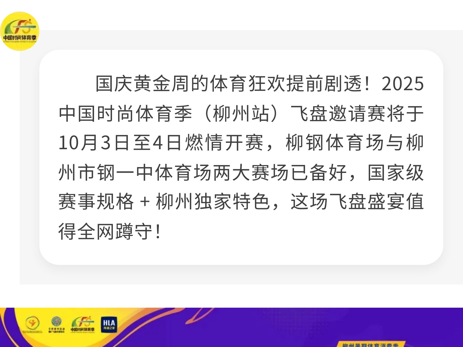 燃動(dòng)柳州!中國(guó)時(shí)尚體育季飛盤邀請(qǐng)賽16豪強(qiáng)集結(jié),九支勁旅先睹為快 發(fā)布時(shí)間:2025年09月30日 16時(shí)來(lái)源:本站原創(chuàng)瀏覽:123 人次