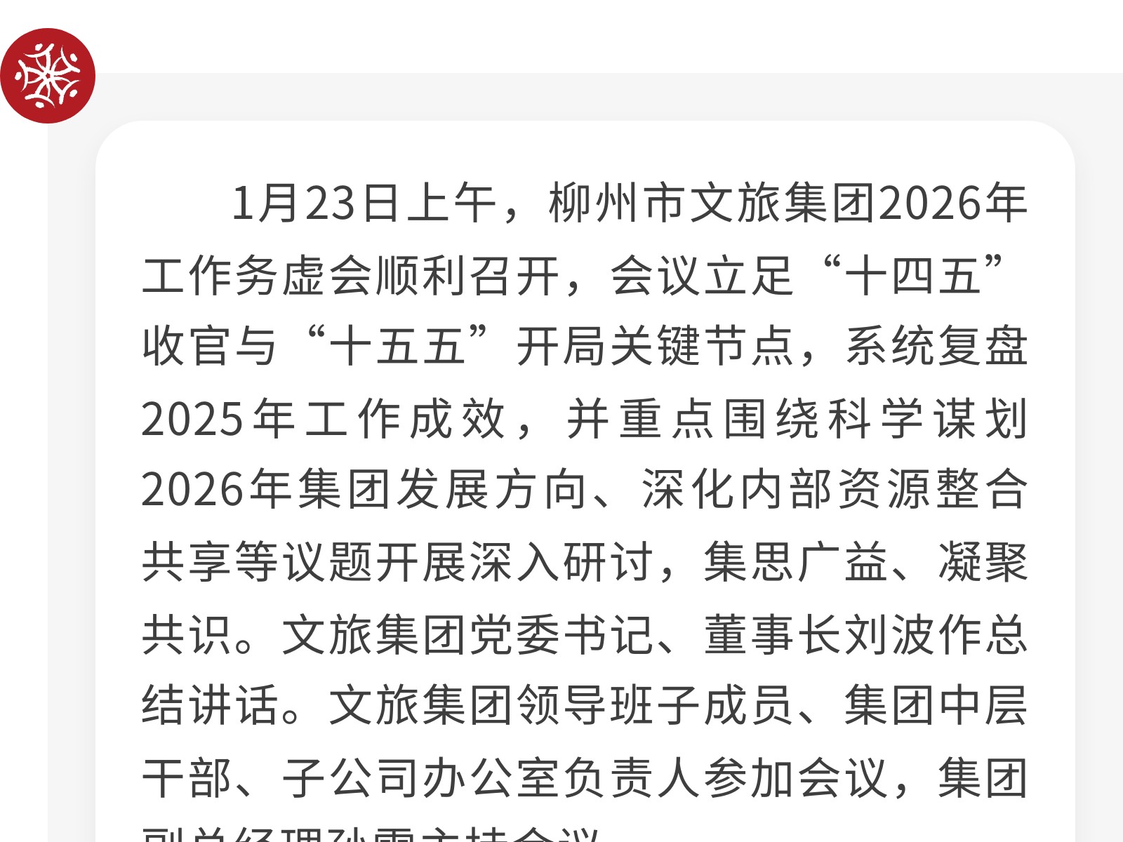 承前啟后謀新篇 凝心聚力向未來——文旅集團(tuán)召開2026年務(wù)虛會(huì) 發(fā)布時(shí)間:2026年01月27日 12時(shí)來源:本站原創(chuàng)瀏覽:27 人次