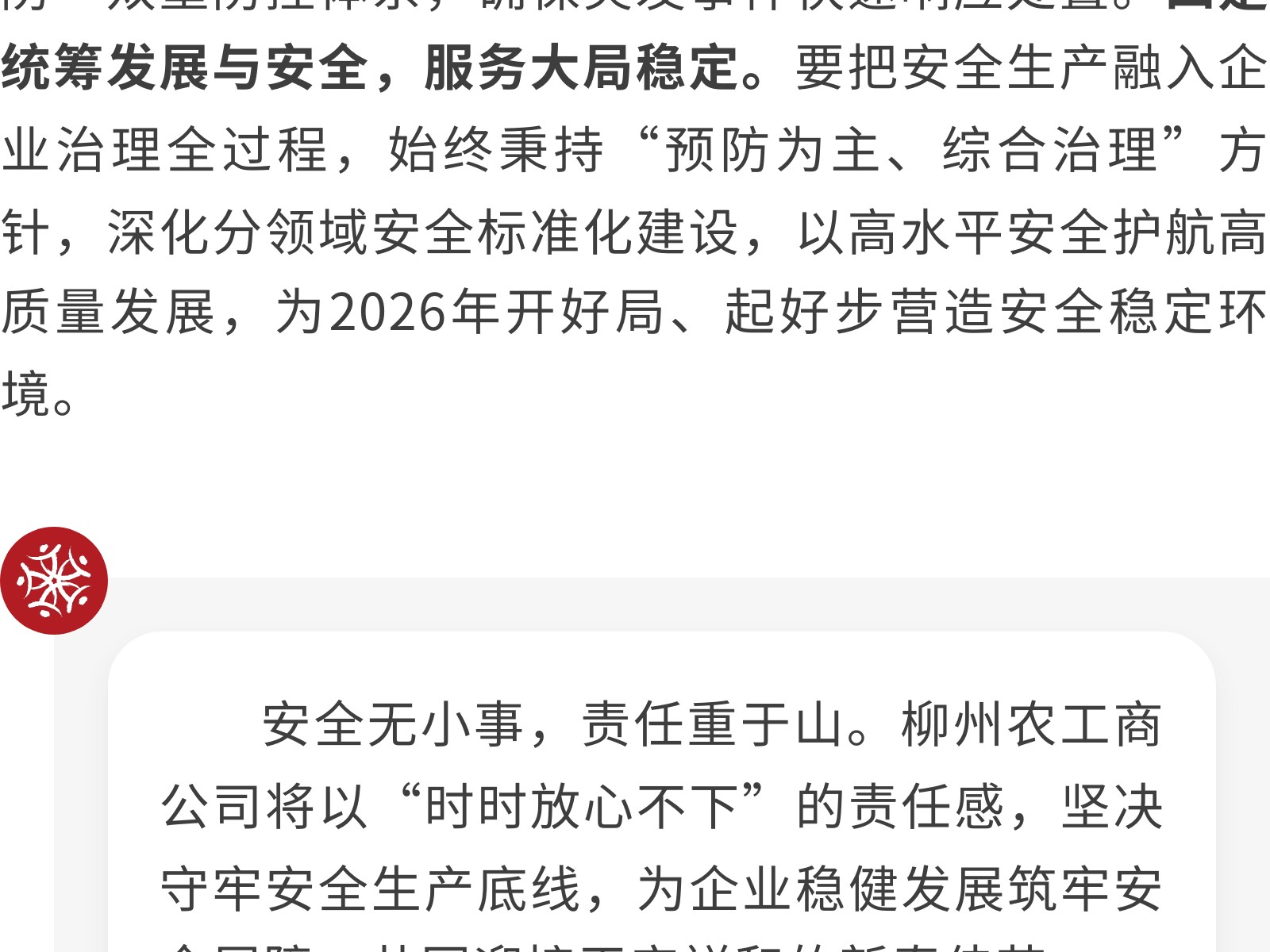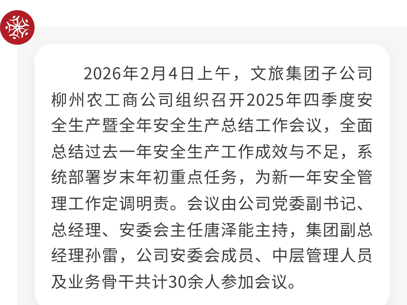 壓緊責(zé)任鏈條,筑牢歲末年初安全防線——柳州農(nóng)工商公司召開2025年度安全生產(chǎn)總結(jié)會 發(fā)布時間:2026年02月06日 12時來源:本站原創(chuàng)瀏覽:52 人次