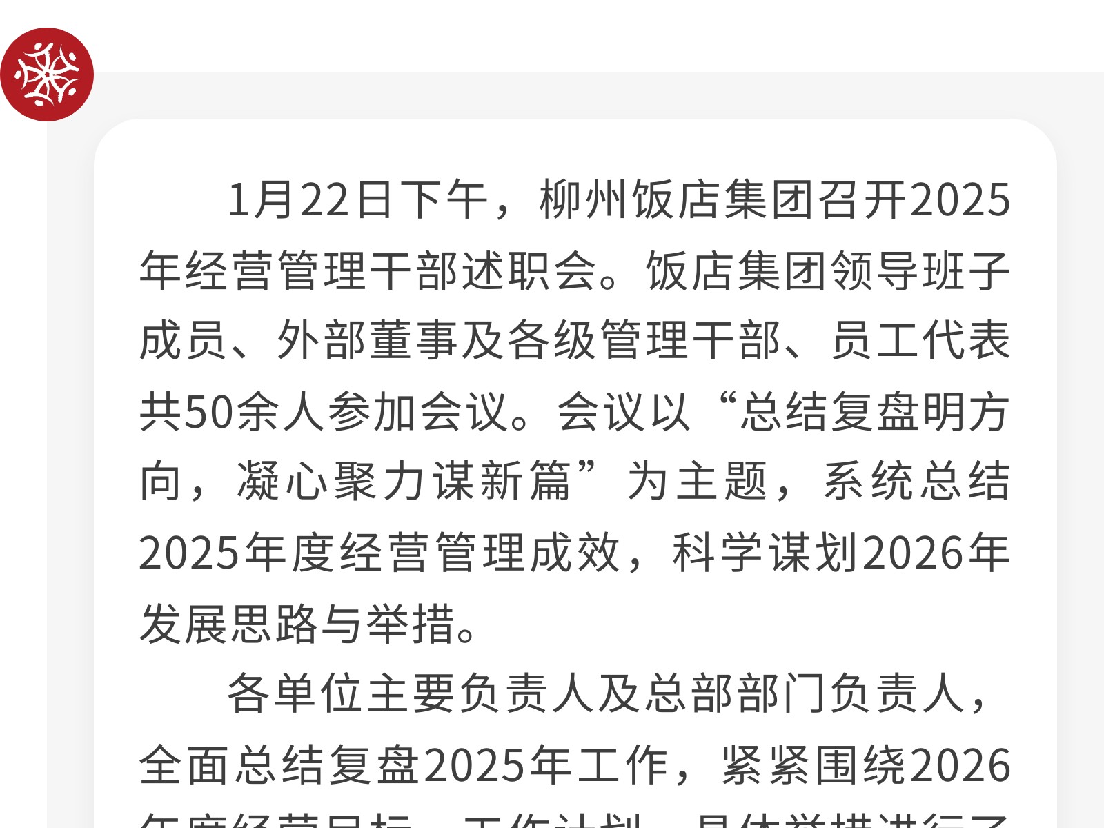 述職亮答卷,乘勢開新局——柳州飯店集團召開2025年經營管理干部述職會 發(fā)布時間:2026年01月29日 10時來源:本站原創(chuàng)瀏覽:25 人次
