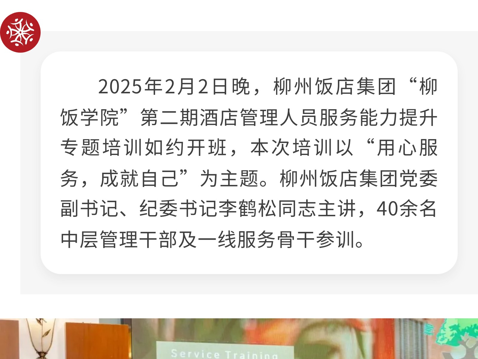 精耕服務啟新程,聚力向善謀突破——柳州飯店集團開展“用心服務,成就自己”酒店管理人員服務能力提升專題培訓 發(fā)布時間:2026年02月13日 13時來源:本站原創(chuàng)瀏覽:77 人次